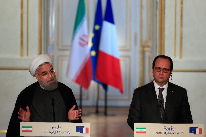 2016年1月29日,访问法国的伊朗总统鲁哈尼(左)与时任法国总统奥朗德在巴黎出席新闻发布会。访问期间,两国签署了多项经贸合作协议。