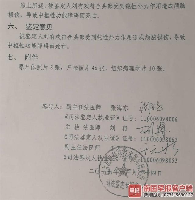 法大法庭科学技术鉴定研究所的司法鉴定意见显示:刘有欢符合头部受到钝性外力作用造成颅脑损伤,导致中枢性功能障碍而死亡。
